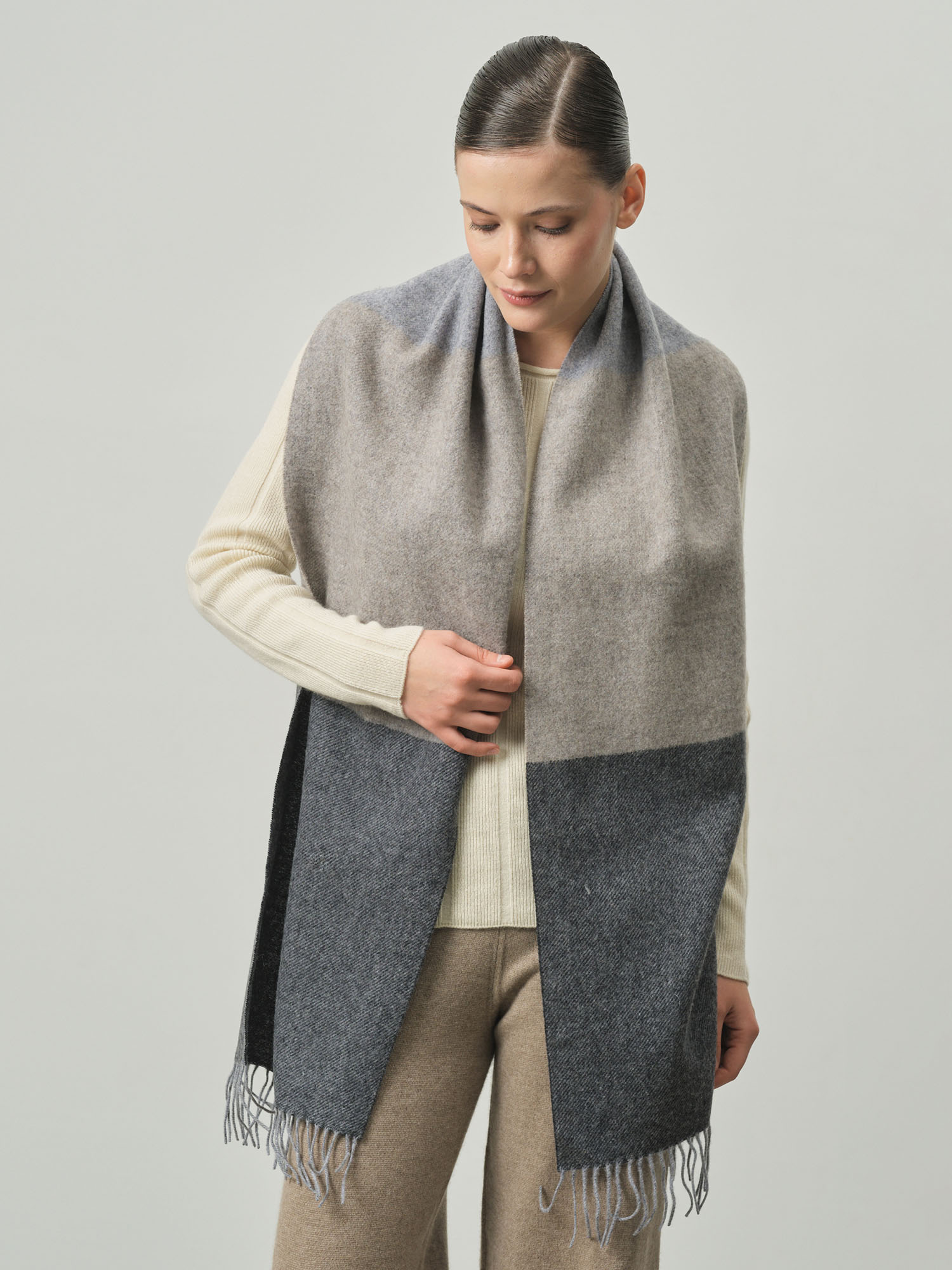 Долго искала идеальный шарф. Натуральная шерсть на ощупь очень мягкая, сочетание светло-серого и темно-серого добавляет образу особую элегантность. Тепло и стильно! |