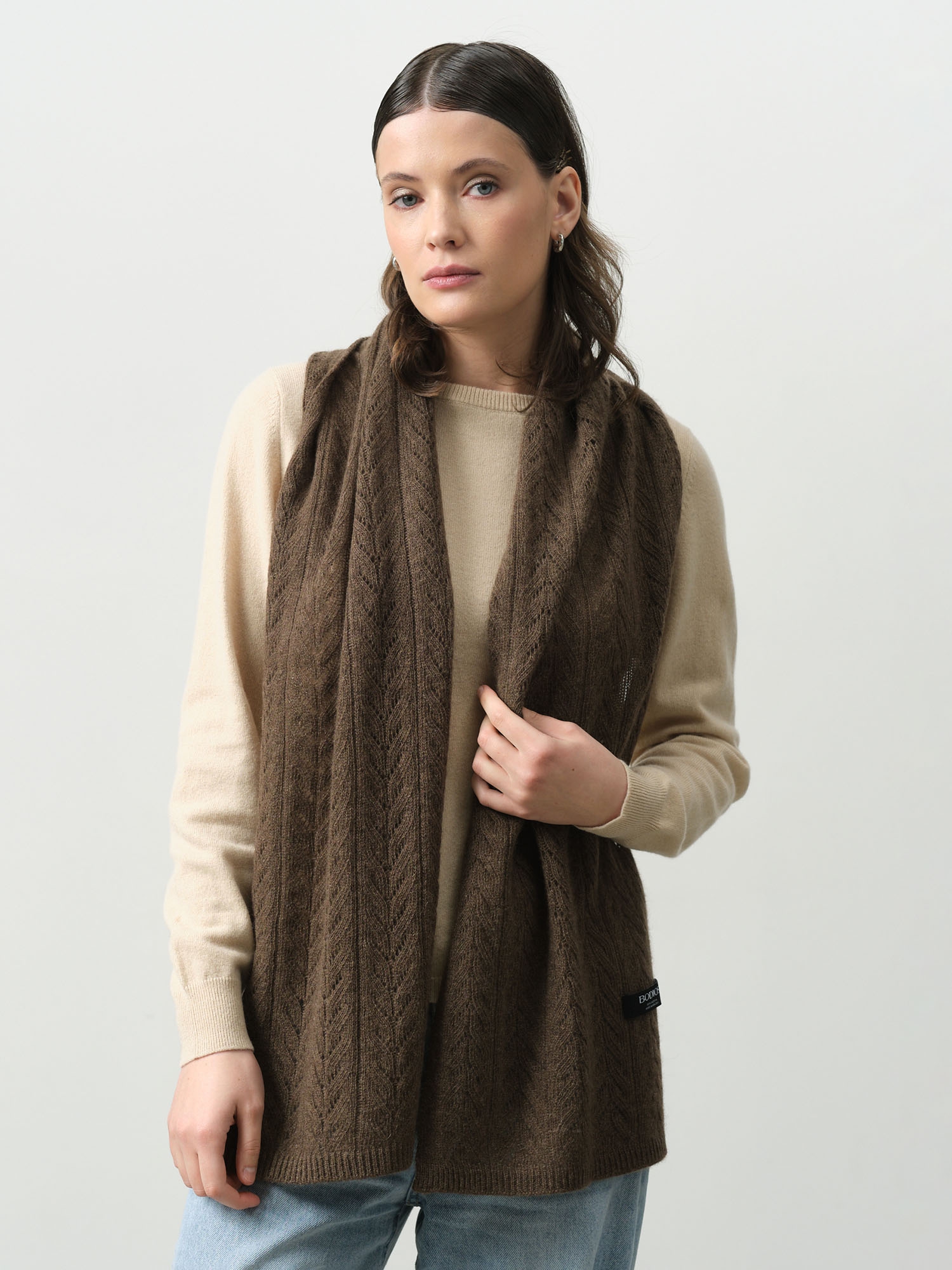Шарф из пуха яка 15003b в коричневом оттенке — тёплый и элегантный аксессуар, который сочетает природную мягкость натурального волокна и лаконичный современный дизайн. Модель придаёт образу уют и благородную текстуру, гармонично дополняя повседневные и классические комплекты.