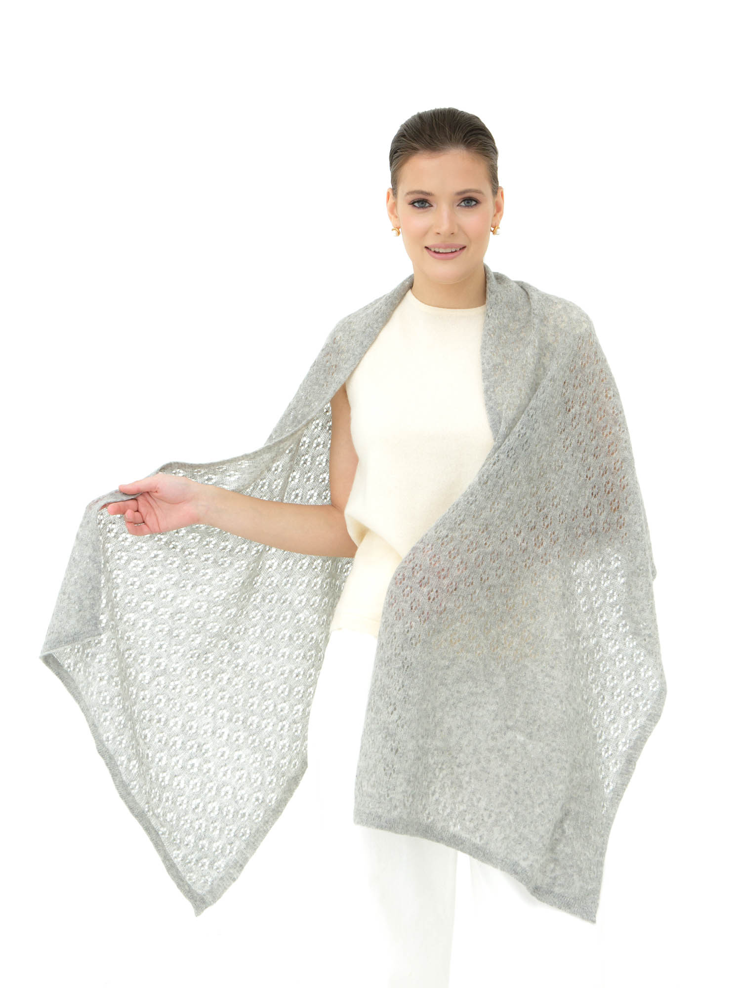 Модель выполнена в свободной форме с выразительной фактурной вязкой, создающей объёмную текстуру. Пластичная структура материала позволяет палантину красиво струиться и формировать мягкие складки.