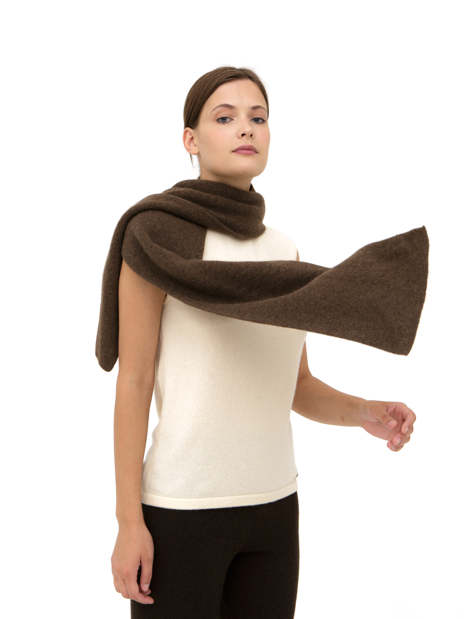 Классическая прямоугольная форма с лаконичной фактурной вязкой. Минималистичный дизайн подчёркивает натуральную текстуру материала и делает аксессуар универсальным для различных образов.