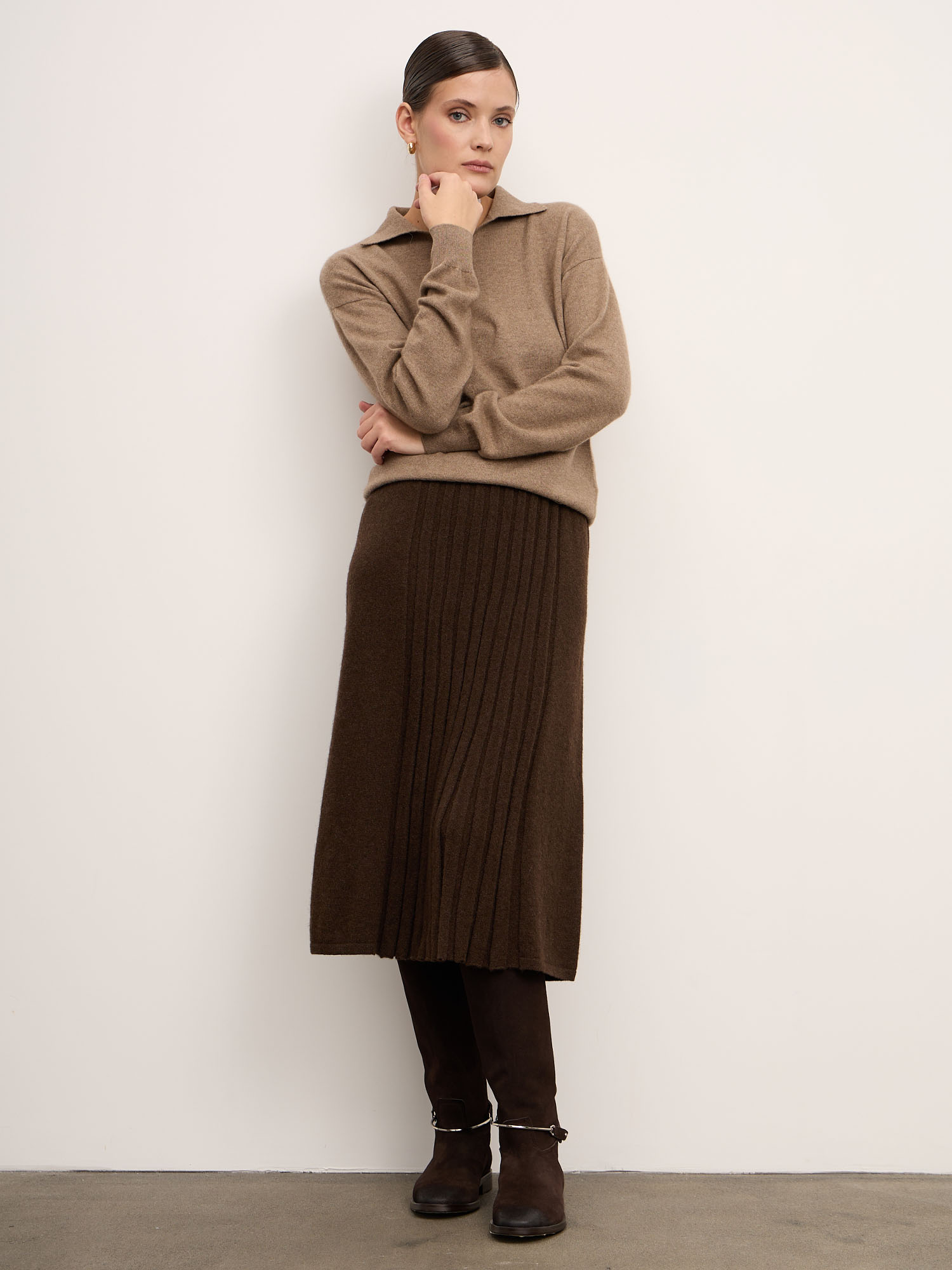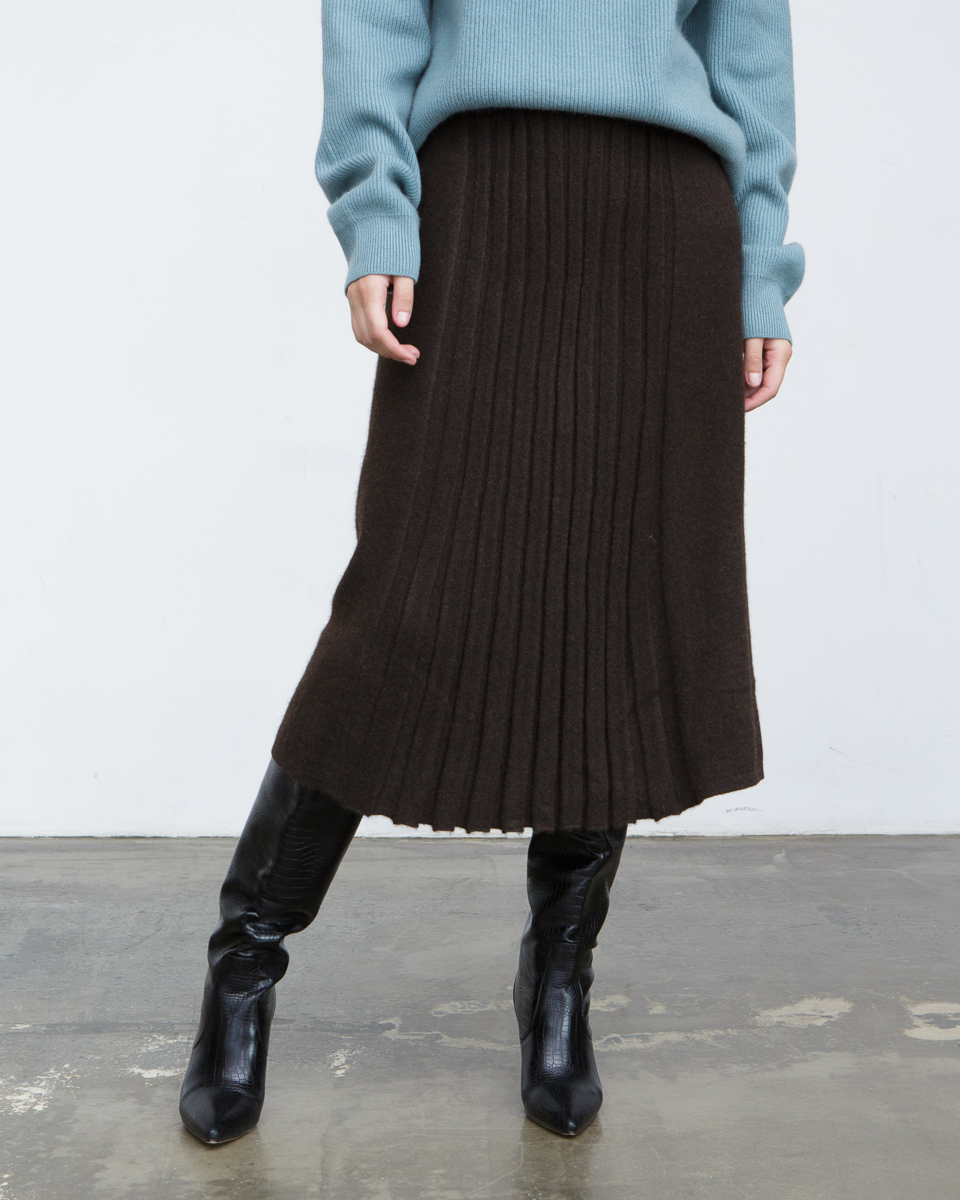 Плиссированная структура по всей длине придаёт юбке лёгкость и визуальную глубину. Модель имеет классический прямой силуэт с мягким расширением книзу.