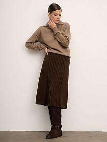 Юбка гармонично сочетается с объёмными свитерами, водолазками и жакетами. Отлично смотрится с ботильонами, сапогами или грубой обувью для создания современного образа.
