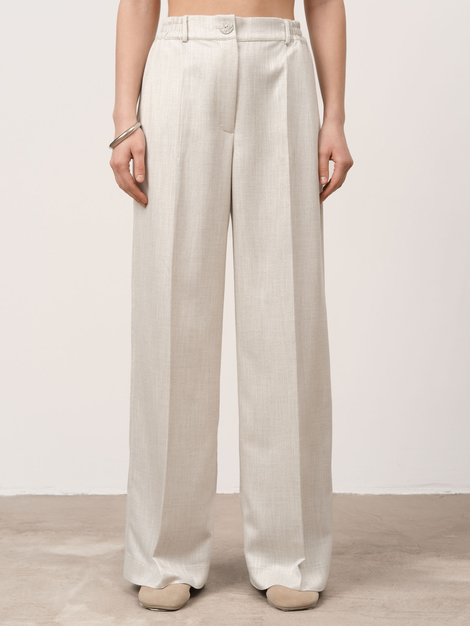 Прямой крой с высокой посадкой, визуально вытягивающий силуэт. Лаконичный дизайн делает модель универсальной для базового гардероба.