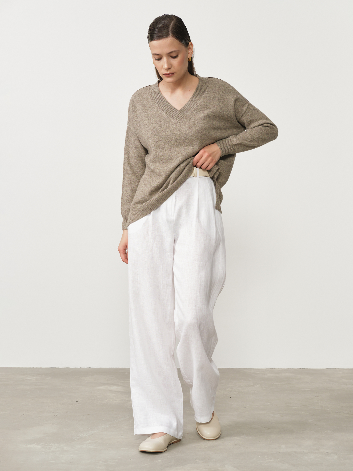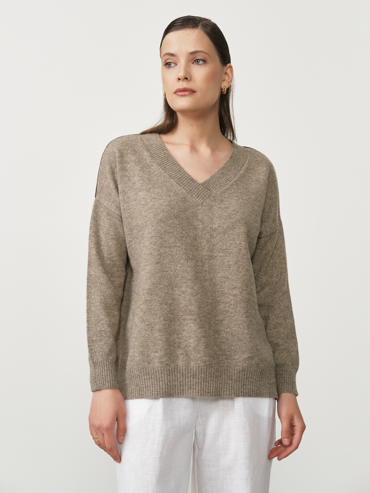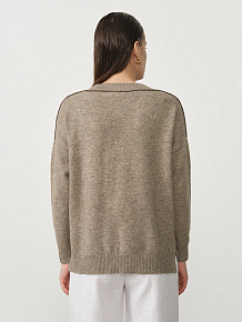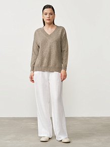 Модель выполнена в минималистичном стиле с V-образной горловиной и длинными рукавами. Чистые линии кроя и мягкая фактура трикотажа подчёркивают натуральную красоту материала.