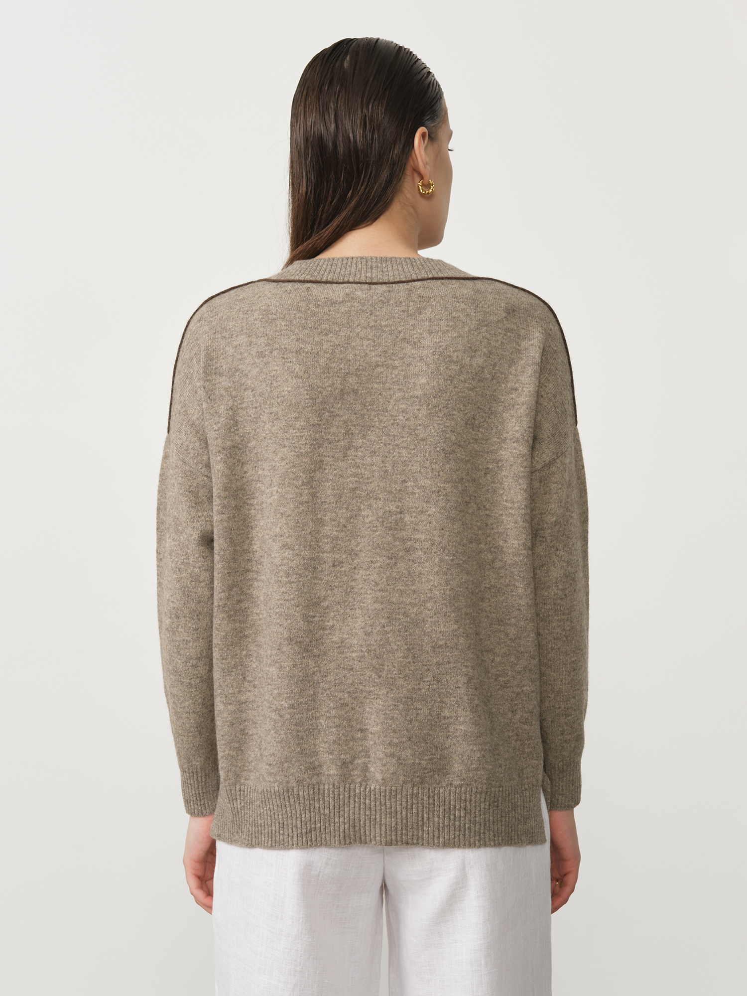 Аккуратная трикотажная отделка горловины, манжет и нижнего края изделия. Мягкая ровная вязка сохраняет форму и подчёркивает качество натурального материала.