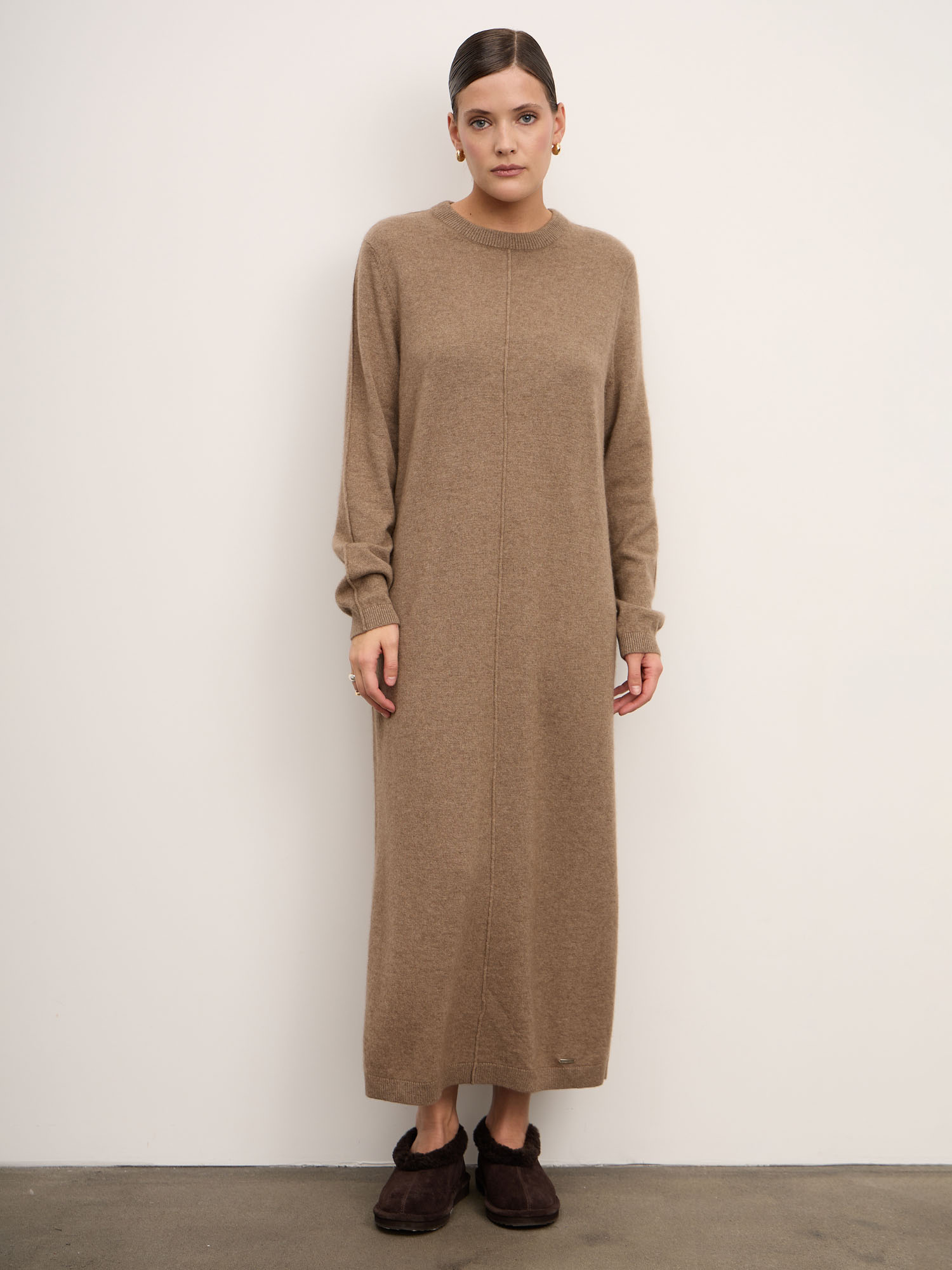 Платье из кашемира — изысканная модель в минималистичном стиле, сочетающая комфорт и элегантность. Свободный силуэт и мягкая фактура делают его идеальным выбором для повседневных образов с акцентом на уют и утончённость.